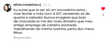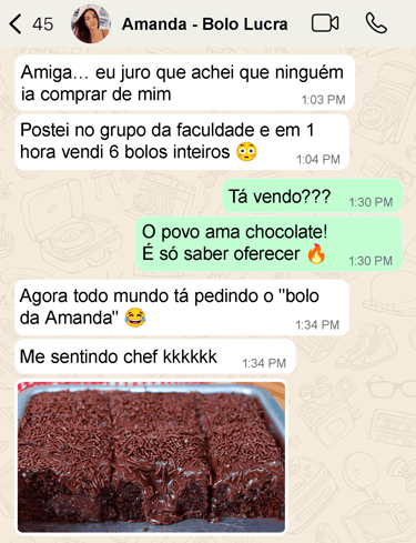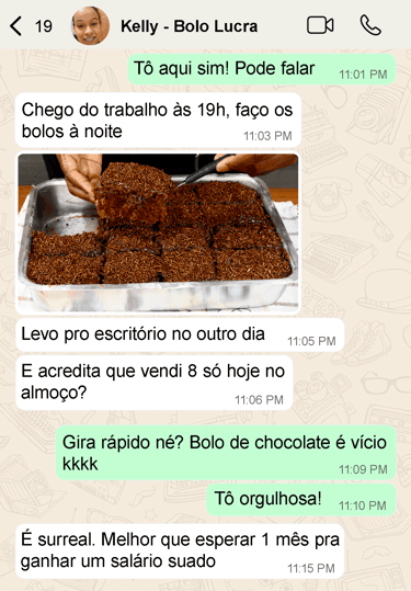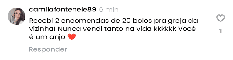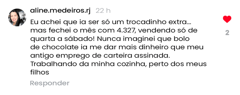 Comecei com só R$30, uma receita simples e muita força de vontade. Aprendi na prática como transformar bolo em dinheiro: testei receitas que vendem, divulguei nos grupos de WhatsApp, criei clientela fiel e conquistei minha independência financeira... e hoje eu faturo mais de 10 mil todos os meses trabalhando da minha casa. Decidi colocar tudo que aprendi nesse Método, de mulher pra mulher, pra te mostrar que é possível sim. Você não precisa ter faculdade, nem experiência — só precisa começar com o que já tem.