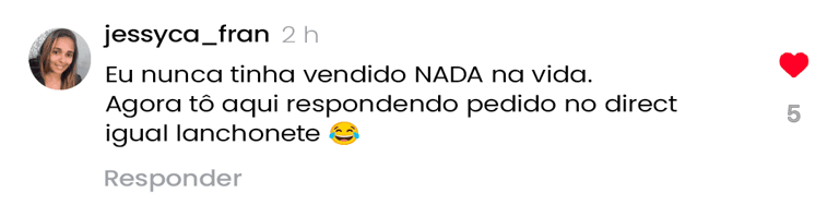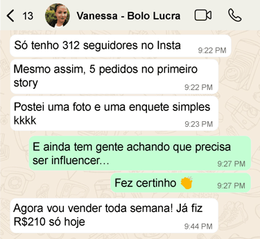Tem alunas que vendem nas primeira 24 horas. Outras demoram uma semana, mas o resultado vem — depende só de você seguir o que é ensinado. É prático, direto e pensado pra dar resultado rápido.